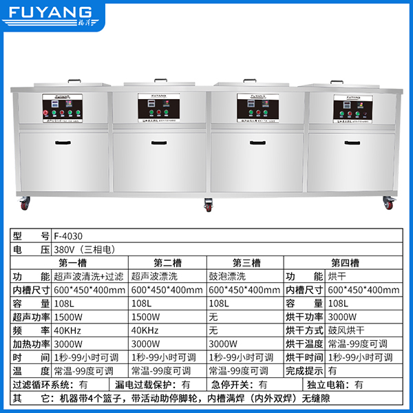 F-4030 | 108L 1500W 工业三槽超声波带过滤漂洗烘干清洗机